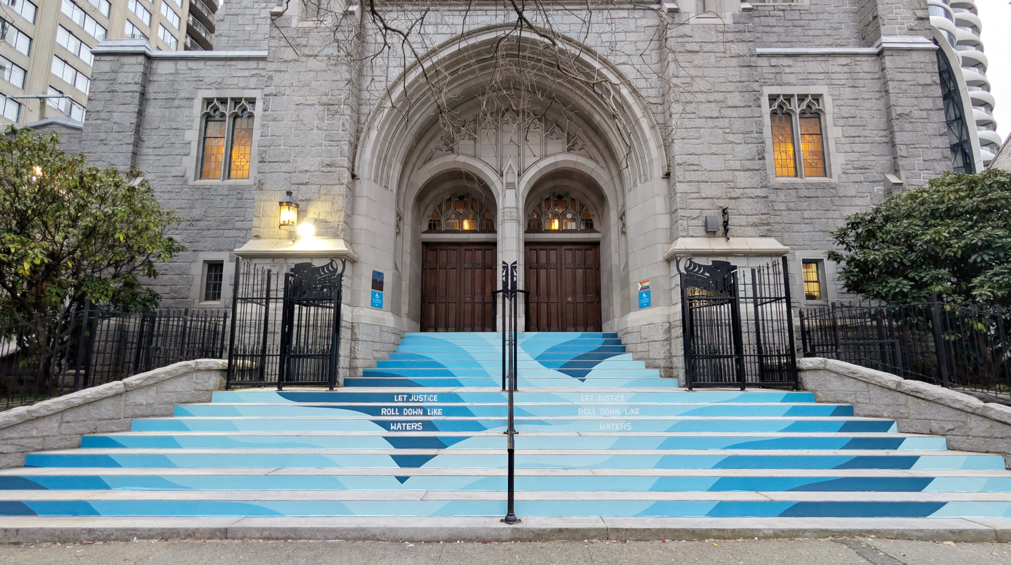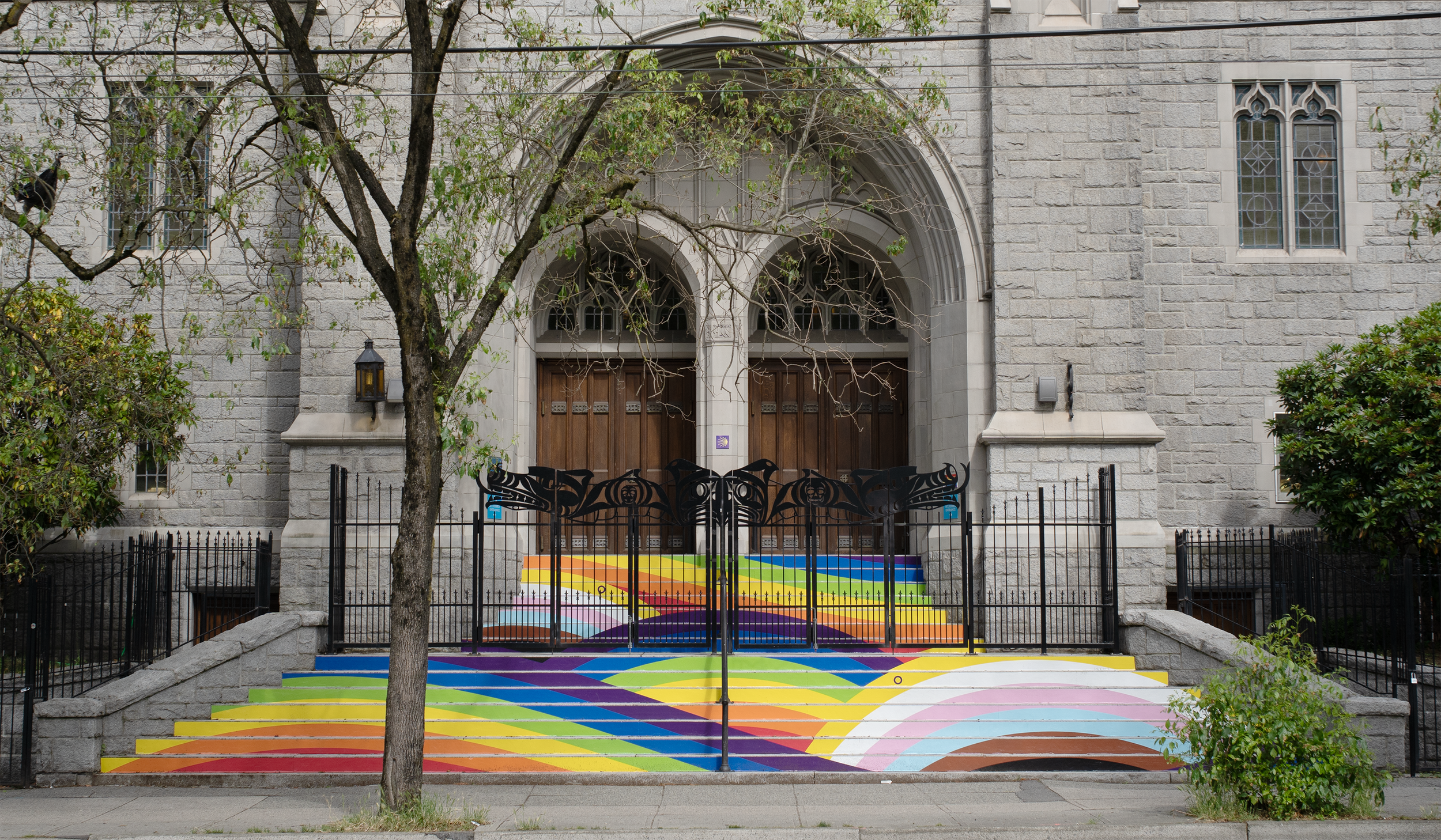 St. Andrew’s Wesley United Church an open-hearted, open-minded, inclusive church located in downtown Vancouver. Their front steps are a beautiful canvas to showcase their values of representing their values of spirit, art, social justice, and inclusion as a way to connect with the community. Designing for the stairs is always a unique challenge, and my approach is to lean into bold, graphic shapes to ensure the design reads clearly from a distance and across different viewing angles.